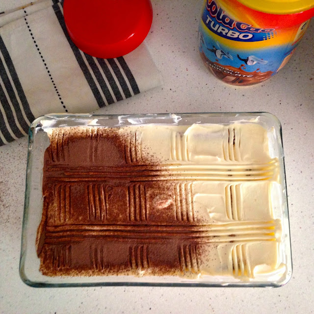 8. Espolvorear en esta última capa chocolate en polvo (o en su defecto usar Colacao) con ayuda de un colador.